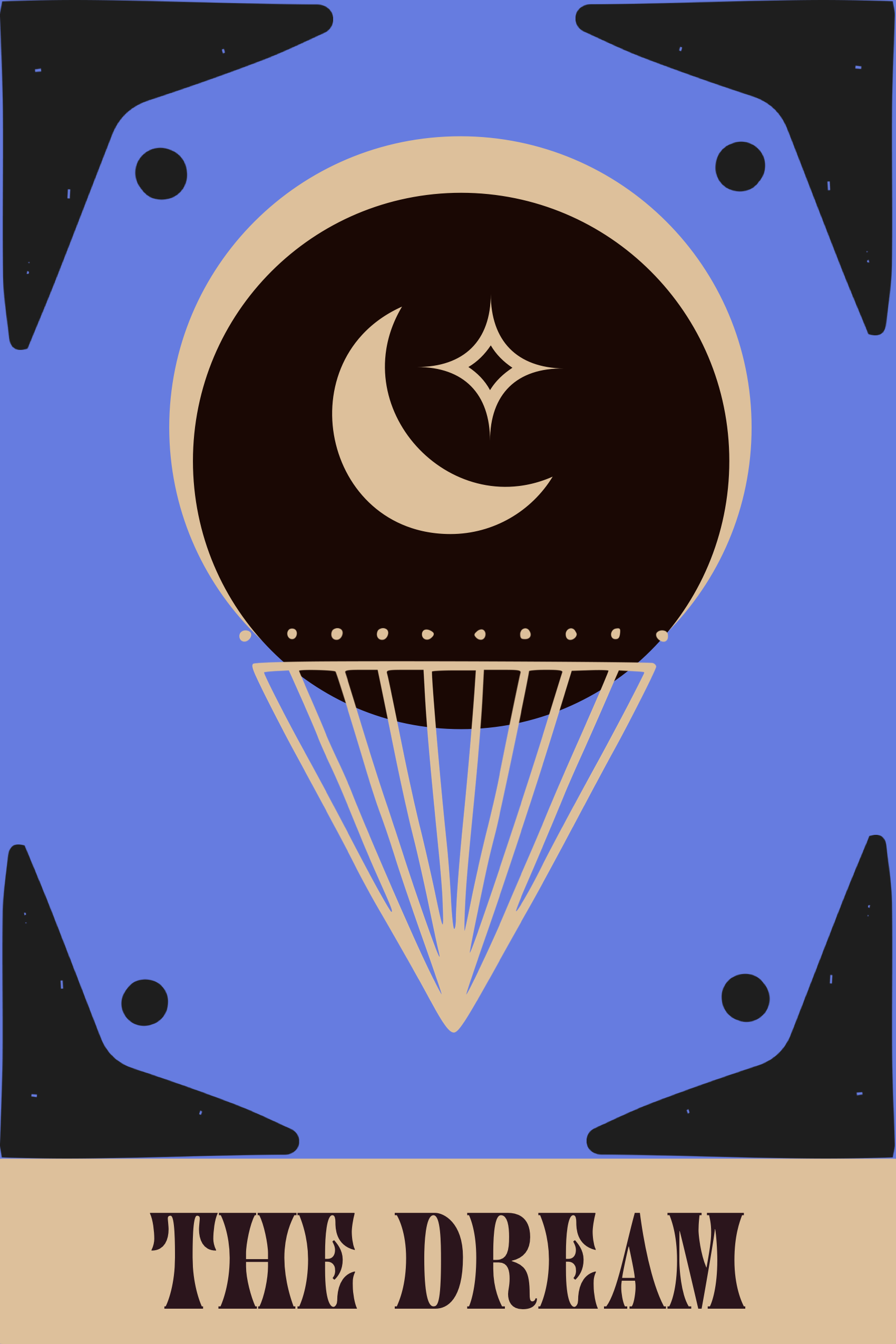 [Image Description: Digitally illustrated vector graphic of a black circle with a cream colored cresent moon and star centered in the middle of the frame. A cream colored circle is behind the black circle rests on top a cream colored triangle The title on the bottom of the frame reads: The Dream (in upper case bold black decorative lettering)