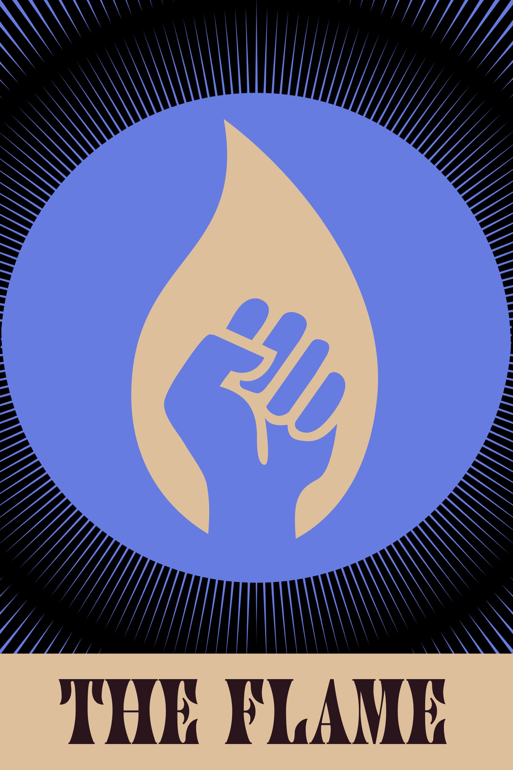 [Image Description: Digitally illustrated vector graphic of Silhouette of purple fist centered in the middle of the frame. The purple fist is also centered in the middle of cream colored illustration of a flame. The title on the bottom of the frame reads: The Flame (in upper case bold black decorative lettering)